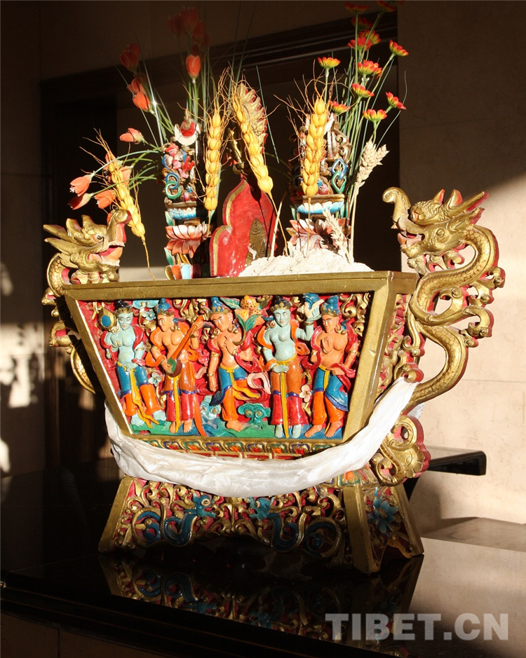 藏歷1月1日,是藏族人民一年一度最重要的節(jié)日。在拉薩,從藏歷12月初開始,我的鄰居們就開始打掃衛(wèi)生、準(zhǔn)備年貨了,其中,木雕彩繪的精致方斗“切瑪”和一些面粉制作的點(diǎn)心是每家必備的供品。“切瑪”內(nèi)裝滿酥油拌好的糌粑、炒熟的青稞和人參果等食品,上面插上青稞穗、雞冠花,有的還要撒上酥油做的彩花板。同時(shí),供品的旁邊還要擺放一個(gè)彩色酥油花塑的羊頭,到了初一那天,再將提前浸泡長(zhǎng)出兩寸青苗的青稞種子擺于佛龕茶幾之上。這些擺設(shè)表達(dá)著對(duì)新的一年風(fēng)調(diào)雨順、農(nóng)牧業(yè)獲得豐收祈愿。