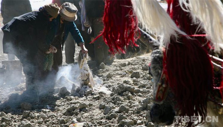 婦女們和沒有參賽的男人們?cè)谔镞叾焉习刂?、灑上青稞面、澆上青稞酒,然后點(diǎn)燃,進(jìn)行煨桑祈福。