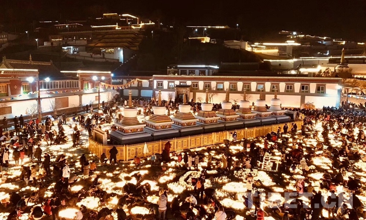 今年藏歷10月底正好是公歷的12月底,晚上氣溫已降到零下七、八度。我穿著藏式的羊皮襖瑟縮著加入了轉(zhuǎn)經(jīng)的人流中,人群一擁擠,再加上走動(dòng),還有千萬盞油燈散發(fā)出的熱量,寒意漸漸就散去了。