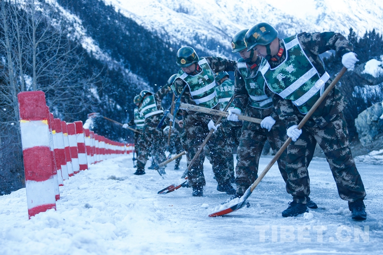 圖為官兵在川藏線然烏湖段清理路面積雪結(jié)冰