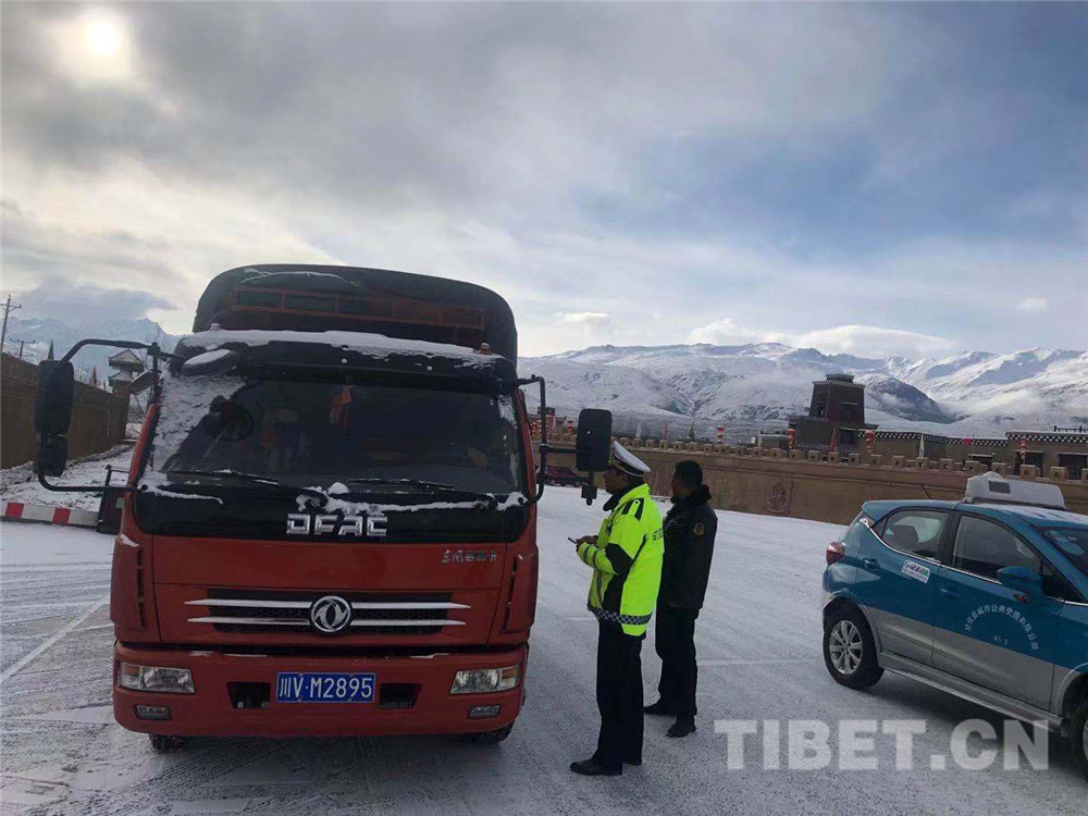 圖為甘孜縣公安交警大隊(duì)對來往車輛進(jìn)行檢查
