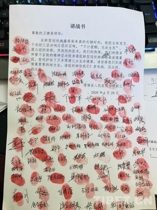 中國西藏網(wǎng)訊 “請(qǐng)安排我們到疫情最需要的地方去,請(qǐng)組織相信我們!若有戰(zhàn),召必回,戰(zhàn)必勝?!?月29日,理塘縣人民醫(yī)院100余醫(yī)護(hù)人員在一份集體請(qǐng)戰(zhàn)書上莊嚴(yán)簽名。