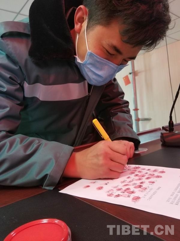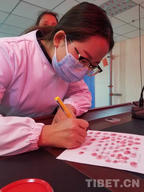 圖為理塘縣人民醫(yī)院醫(yī)護(hù)人員在請(qǐng)戰(zhàn)書上莊嚴(yán)簽名 攝影:格卓瑪