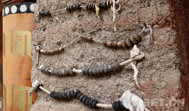 圖為寺廟土墻上信徒用來(lái)記數(shù)的珠子