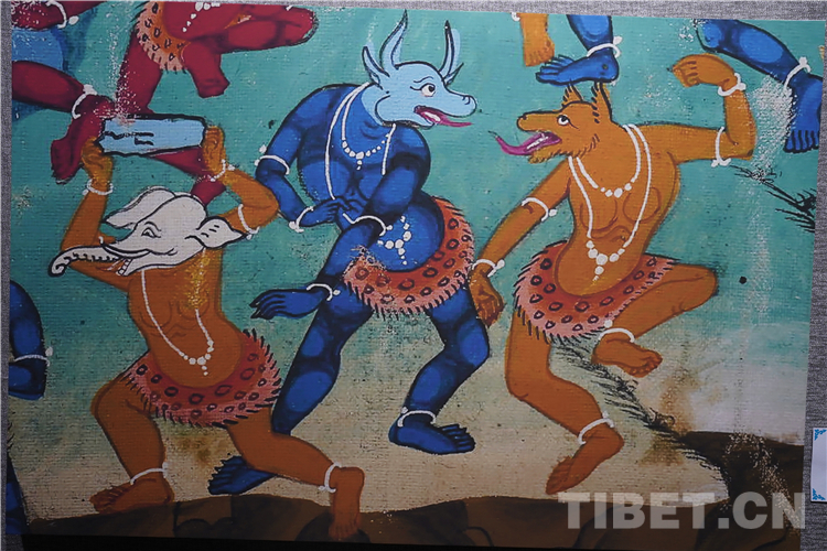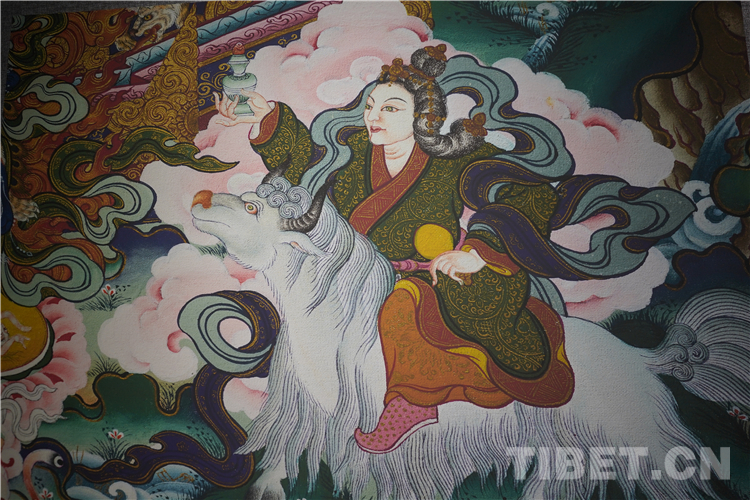 展廳中還有一副遠(yuǎn)看非常另類,細(xì)細(xì)欣賞漢藏繪畫風(fēng)格交流交融的作品,那是一幅四川省阿壩藏族羌族自治州金川縣墨爾多神山壁畫的局部作品。東智先生說:“這幅局部畫作從發(fā)髻、服飾等多個(gè)方面充滿了漢族風(fēng)格,甚至人物穿的還是漢服,座下是像馬一樣的牦牛,但是手上掄著古朵(古朵指的是用牦牛毛或者山羊毛編織成的拋石繩,可以將石頭投擲到較遠(yuǎn)的地方,是牧民們用來放牧的工具),非常有辨識(shí)度,充滿藏族文化特色?!?/p>