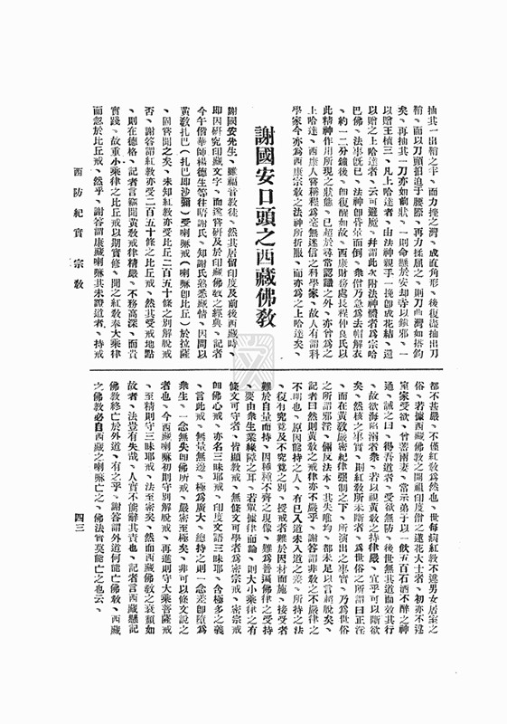 1887年,謝國安出生在今四川省甘孜縣絨壩岔。他的藏名為多吉卓巴,后因信仰基督教,取名Paul Sherap(人稱智慧保羅,我們注意到此名帶有藏文音譯),漢名謝國安。10歲時,他離開家鄉(xiāng)進入拉薩哲蚌寺學經。不久,謝國安離開寺廟,跟隨藏商商隊去了錫金甘托克、印度大吉嶺的教會學校學習藏文、英文和梵文。后應孟加拉亞洲學會之請,到加爾各答參與校訂《藏文大藏經·甘珠爾》。他兼通藏、英、梵三種文字,熟練地用藏、英語會話。辛亥革命爆發(fā)后,他返回內地,之后定居康定。此后一段時間在康定的國立師范學校任教,主持編寫了多部教材,如《西康國語教科書》(8冊)、《西康常識教科書》(8冊)、《西康公民教科書》等。這套教科書編輯方法,系根據教育部頒“小學課程標準”及西康特殊環(huán)境,先編漢文,再用藏文譯注,對民國時期西康教育發(fā)展和推廣起到特殊的推動作用。他曾在西康舉辦的“縣訓班”擔任藏文教員。當時著名學者李思純曾在康定見過他,印象較好,認為他“居印度甚久,故能操英語等,現居康定,研習藏文甚深。”1938年,著名學者柯象峰到康定一帶考察時,受到謝的熱情接待和幫助。他在日記里對謝國安頗有贊詞,10月9日的日記中提到“午時左右,謝國安君來訪,托其購佛經數部?!睅滋旌笾x國安即將“購得之佛經十余部一一為之譯名及指出出版處”。