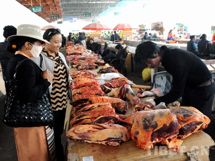 這是在那曲鎮(zhèn)綜合市場(chǎng),許多牧民群眾乘坐客運(yùn)班車來這里銷售剛宰殺的牛羊肉(唐召明2012年8月6日攝)