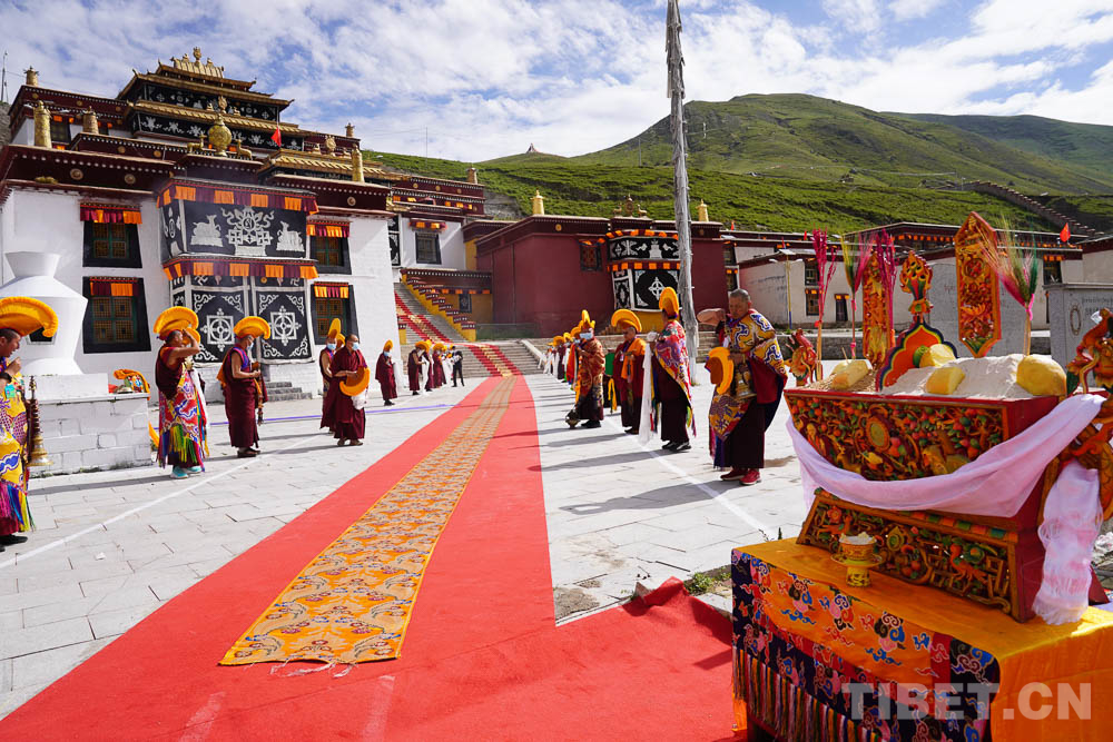 為了迎接十一世班禪的到來,索縣贊丹寺也早早地做好了準(zhǔn)備。贊丹寺是藏北地區(qū)最早的格魯派寺院,修建在雅拉多山頂上,外形酷似布達(dá)拉宮。寺內(nèi)珍藏大量的佛像、壁畫、藏經(jīng)印冊等,具有很高的文物和藝術(shù)價(jià)值。8月21日,在寺廟僧眾的誦經(jīng)聲中,十一世班禪登上措欽大殿寶座為僧眾摸頂賜福,傳授《達(dá)妥瑪開光儀軌》《上師供儀軌》《時(shí)輪金剛祈愿文》。