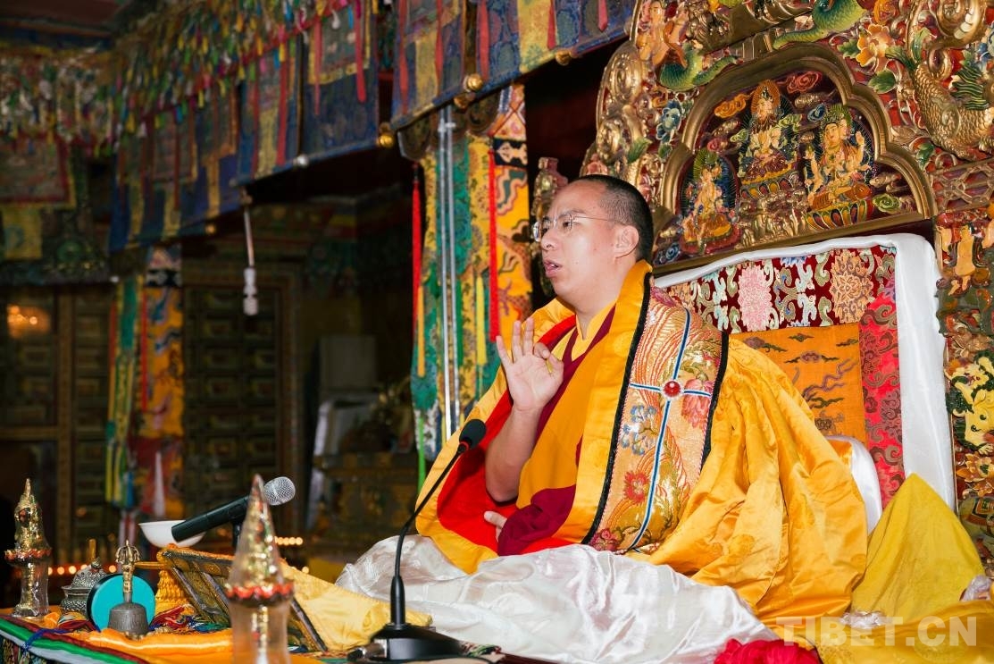 十一世班禪在達(dá)孜寺杜康殿為僧眾傳授《隨許皈依經(jīng)》和《菩提道矩論》 攝影:鄭朔