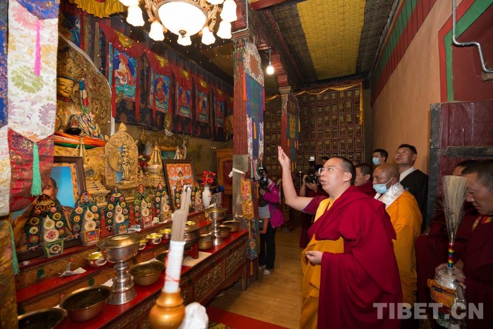 在溪水環(huán)抱的達(dá)孜寺,十一世班禪先后進(jìn)入杜康殿、度母殿、護(hù)法神殿禮佛,隨后在杜康殿為僧眾摸頂賜福,傳授《隨許皈依經(jīng)》和《菩提道矩論》。寺廟僧眾向十一世班禪敬獻(xiàn)曼扎。