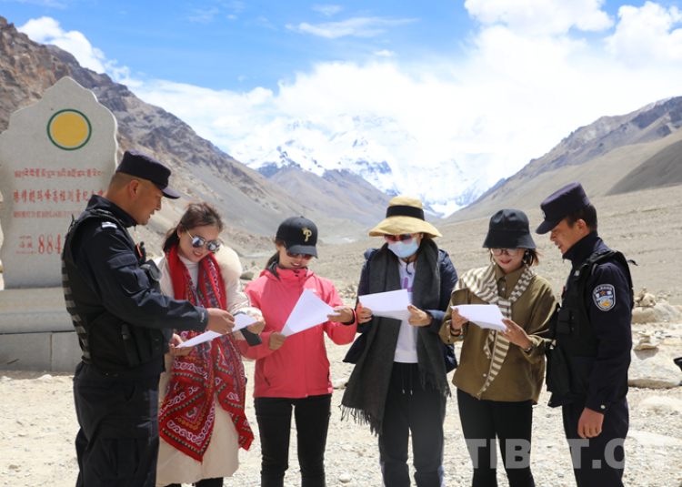 圖為珠峰邊境派出所民警在珠峰大本營(yíng)執(zhí)勤點(diǎn)向游客開展生態(tài)環(huán)境保護(hù)宣傳 攝影:畢琦