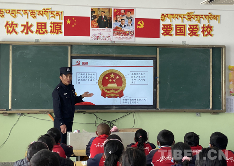 圖為崗嘎邊境派出所民警在崗嘎鎮(zhèn)中心小學(xué)教室內(nèi)為學(xué)生開展愛國(guó)主義教育 攝影:陸佳希