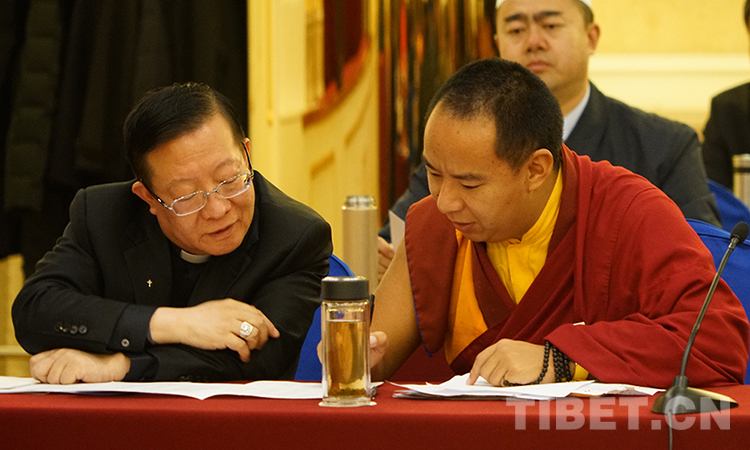 圖為2018年全國兩會期間,十一世班禪參加小組會時與中國天主教主教團(tuán)主席馬英林討論 攝影:宋家麗
