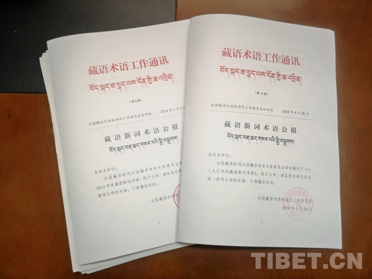 2018年,全國(guó)藏語(yǔ)術(shù)語(yǔ)標(biāo)準(zhǔn)化工作委員會(huì)發(fā)布了《黨的十八大以來審定的藏語(yǔ)新詞術(shù)語(yǔ)》,包含了“習(xí)近平新時(shí)代中國(guó)特色社會(huì)主義思想”“虛擬現(xiàn)實(shí)”“代駕服務(wù)”“構(gòu)建人類命運(yùn)共同體”“逆全球化”“最多跑一次”等近1500條熱門、高頻詞匯,涉及政治、經(jīng)濟(jì)、社會(huì)、科技等多個(gè)方面,取得良好的社會(huì)反響。