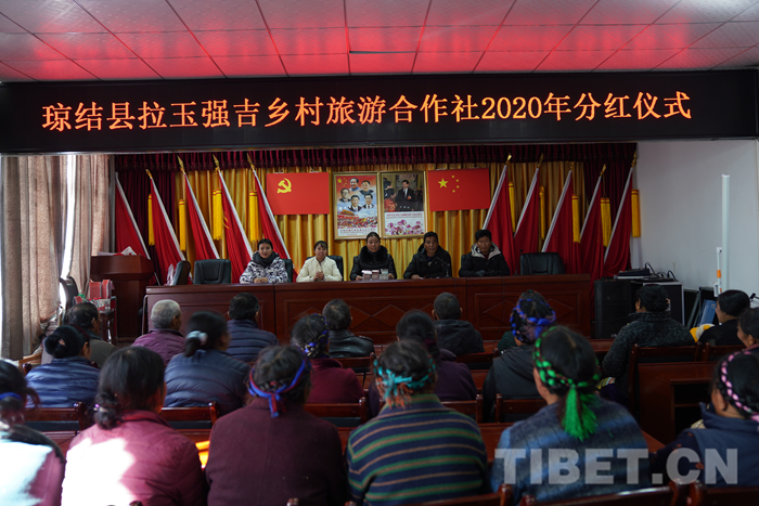 這是拉玉強(qiáng)吉鄉(xiāng)村旅游專業(yè)合作社首次分紅儀式的現(xiàn)場,44戶村民代表臉上掛滿了笑容,準(zhǔn)備分享勤勞付出結(jié)出的香甜碩果。