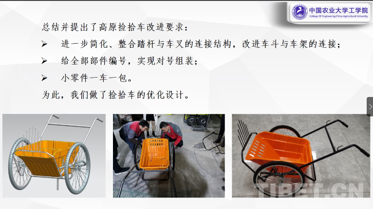 啟動會上,高原撿拾車研發(fā)首席專家中國農(nóng)業(yè)大學(xué)工學(xué)院教授王光輝介紹了高原撿拾車最新改版的情況。他表示,針對過去推廣中發(fā)現(xiàn)的個別問題,對車子進(jìn)行了優(yōu)化設(shè)計,去掉了易發(fā)生損壞的控叉線閘,調(diào)整了車身的踏桿與車叉的連接結(jié)構(gòu),改進(jìn)車斗與車架的連接,做到了對號組裝和小零件一車一包等,使安裝更加便捷、使用更加方便、車子更加堅固。