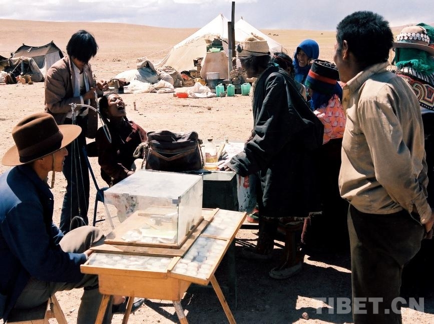 圖為在文部辦事處(現(xiàn)改為尼瑪縣)賽馬會(huì)上,“候鳥(niǎo)”型的漢族商販在擺攤鑲牙和修表(唐召明1987年攝)