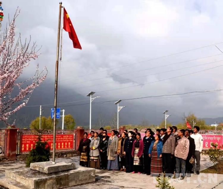 圖為稅收干部和當(dāng)?shù)厝罕娫谖鞑刈灾螀^(qū)日喀則市吉隆鎮(zhèn)達(dá)曼村開展升國(guó)旗儀式