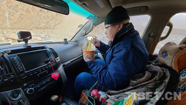 圖為呂智勇自駕向阿里普蘭運(yùn)送防疫物資期間,在車(chē)?yán)锍苑奖忝?/p>