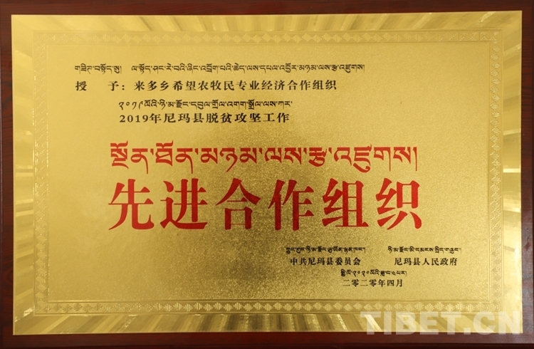 圖為尼瑪縣委、政府頒發(fā)的先進(jìn)合作組織獎(jiǎng)牌