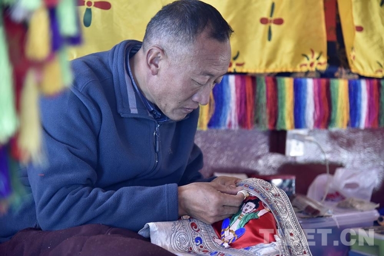 圖為2021年4月拍攝的西藏自治區(qū)非物質文化遺產項目拉薩堆繡唐卡代表性傳承人羅布正在制作堆繡唐卡 攝影:王媛媛