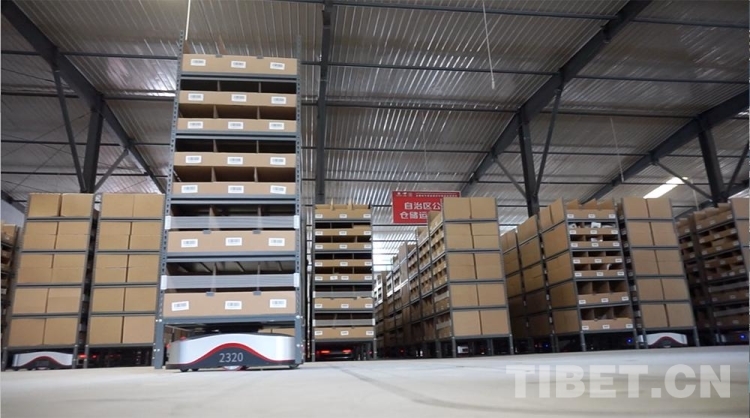 圖為西藏自治區(qū)級公共物流倉儲配送中心里,作業(yè)人員將搬運型機器人“地狼”載來的貨架上的貨物取出