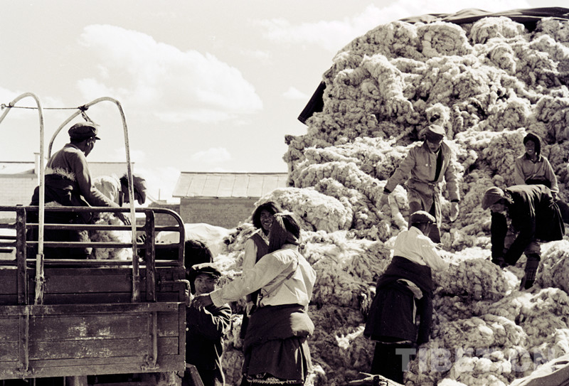 這是藏北雙湖辦事處(現(xiàn)雙湖縣)和平鄉(xiāng)牧民正在裝車外運(yùn)交售的畜產(chǎn)品(唐召明1987年攝)