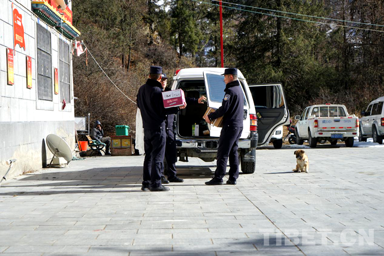 圖為洛桑旦增與民警們將宣傳冊裝上車