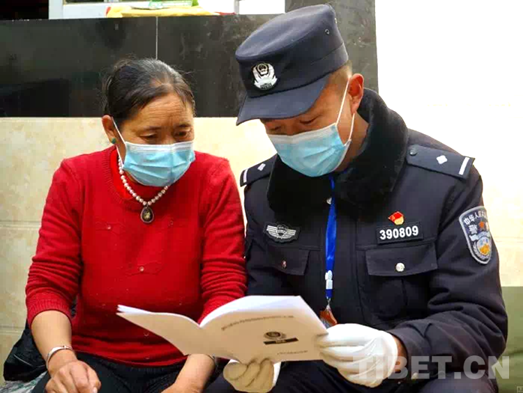 圖為洛桑旦增向轄區(qū)群眾宣傳相關法律規(guī)定和注意事項