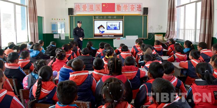 圖為洛桑旦增給學生宣講普法知識