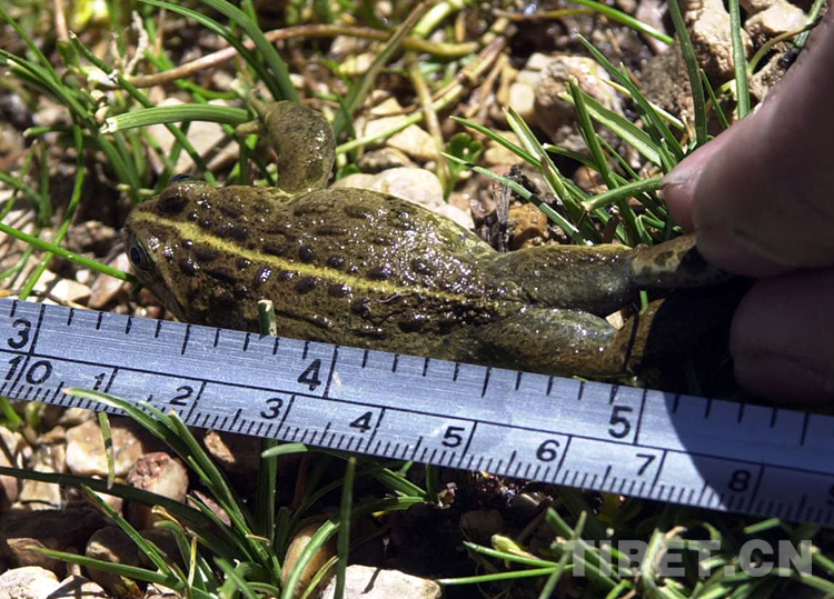 這是藏北無人區(qū)科考團科考人員在給申扎縣雄梅鄉(xiāng)所發(fā)現(xiàn)的高山蛙量體長。這種高山蛙的新發(fā)現(xiàn),填補了我國高海拔地區(qū)沒有蛙類生存的空白(唐召明2001年攝)