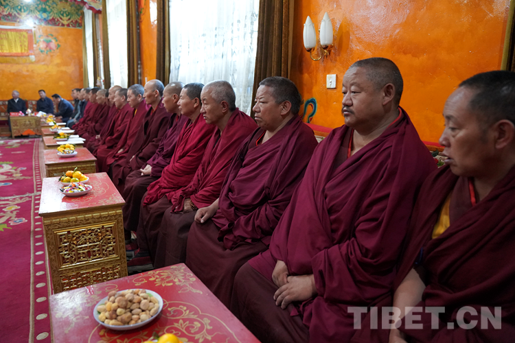 張延清說,今年,在中國共產(chǎn)黨成立100周年,西藏和平解放70周年之際,習(xí)近平總書記作為中共中央總書記、國家主席、中央軍委主席到西藏慶祝西藏和平解放,在黨和國家歷史上是第一次,充分體現(xiàn)了以習(xí)近平同志為核心的黨中央對邊疆地區(qū)的深情牽掛、對西藏工作的高度重視、對西藏各族干部群眾的深厚感情。7月22日下午,習(xí)近平總書記來到建寺600多年的哲蚌寺,受到了全寺僧人最高禮遇的迎接。習(xí)近平總書記充分肯定了哲蚌寺在擁護中國共產(chǎn)黨、擁護社會主義制度、維護祖國統(tǒng)一等方面做出的積極貢獻,并關(guān)心詢問僧人身體狀況特別是老年僧人健康問題,在場的僧人都很感動??v觀世界,國家領(lǐng)導(dǎo)人如此高度重視宗教工作、如此深情關(guān)懷宗教界人士,唯有中國、唯有中國共產(chǎn)黨的領(lǐng)導(dǎo)人。知恩、念恩、感恩、報恩是菩提心的根本。各位僧人朋友們一定要按照習(xí)近平總書記的指示精神,守法敬業(yè)、愛國愛教、潛心修行、向善為民、利益眾生,真正做慈悲為懷的真佛子。