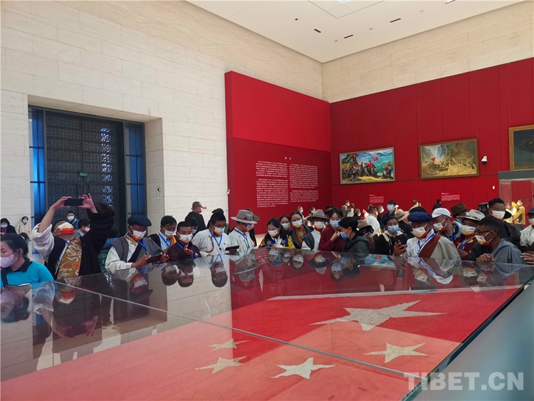 圖為西藏基層干部參觀開國大典上使用過的五星紅旗 攝影:王茜