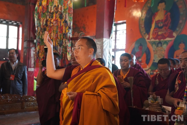 在每所寺院開展佛事活動(dòng)時(shí),班禪按宗教儀軌向僧眾發(fā)放布施、供齋茶、齋飯,同時(shí)關(guān)切詢問(wèn)僧人的學(xué)經(jīng)、修行、生活等情況。班禪在講經(jīng)、闡釋教義的同時(shí),多次勉勵(lì)僧眾要適應(yīng)人民群眾向往追求的方向,講好經(jīng),傳好法,做合格僧尼。言傳身教、以身作則,引導(dǎo)寺廟僧尼和信教群眾正信正行。