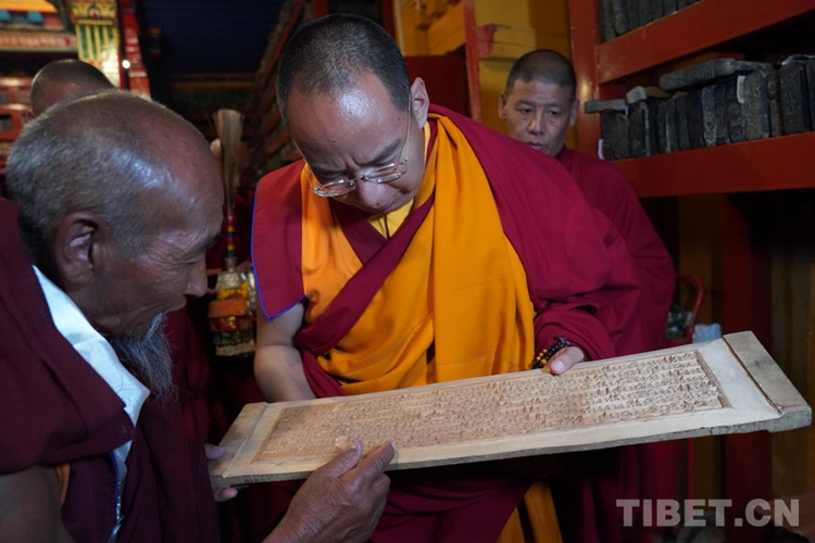 隨后班禪參觀了寺院的印經(jīng)院,納塘寺印經(jīng)院被譽(yù)為“西藏文庫(kù)”。曾刻制印刷大量的藏文經(jīng)典著作。其中包括大藏經(jīng)《甘珠爾》108部、《丹珠爾》225部,都是完整的精刻版,除文字外還有套色版畫。此套印版的首次印刷本現(xiàn)珍藏于扎什倫布寺和布達(dá)拉宮。