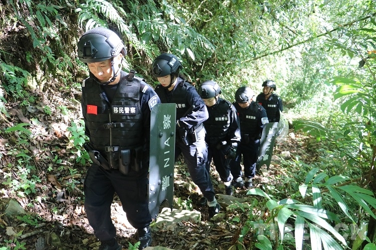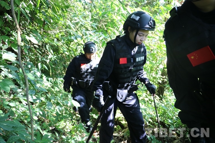 走在隊(duì)伍最前面的是經(jīng)驗(yàn)豐富的老民警李永杰,他手里拿著一把砍刀,一邊清理小路兩側(cè)蔓延出來的枝椏,一邊時刻注意著兩位女民警情況。隨著海拔升高,走進(jìn)樹木茂盛的叢林,陽光只能從郁郁蔥蔥的樹葉間撒下兩三縷光芒,兩名女民警瞪大眼睛好奇地觀察著周圍,對接下來的行程充滿期待。