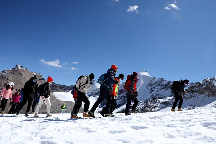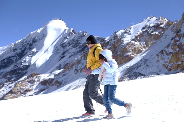 楊女士進藏已有半月,在專業(yè)人士的協(xié)助下她第一次近距離接觸了冰雪世界,并攀登到了海拔5600米的地方?!敖裉煳覜]有高原反應(yīng),帶的氧氣也沒用?!痹谘┥缴蠗钆康呐d奮之情溢于言表。