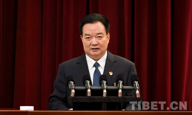 圖為西藏自治區(qū)黨委書記王君正代表中國共產(chǎn)黨西藏自治區(qū)第九屆委員會(huì)向大會(huì)作報(bào)告 攝影:趙耀