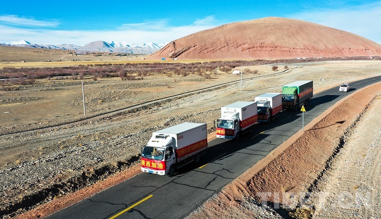 圖為運(yùn)送阿里馳援陜西疫情防控保障物資的貨車(chē)從獅泉河出發(fā) 攝影:普索朗