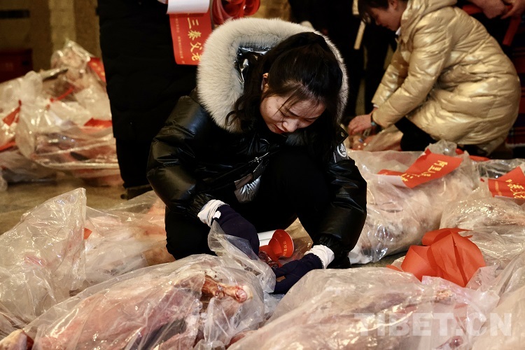 圖為工作人員將物資打包,準(zhǔn)備裝車(chē) 攝影:普索朗