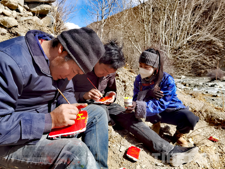 圖為卡熱鄉(xiāng)6個(gè)村(居)第一書記及邊據(jù)村駐村工作隊(duì)正在石頭上手繪國旗