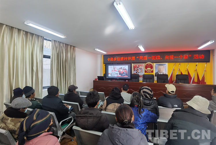 圖為卡熱鄉(xiāng)6個(gè)村(居)第一書記和邊據(jù)村黨員、群眾代表正在觀看講述西藏各族人民愛護(hù)國旗的視頻