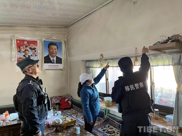圖為林芝邊境管理支隊(duì)里龍邊境派出所民警在轄區(qū)群眾家中查看房屋受損情況 攝影/吳敏