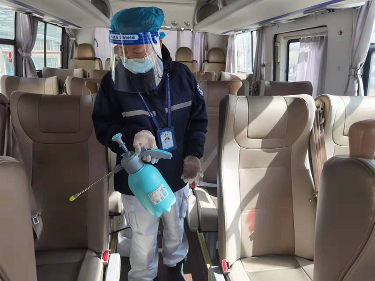 圖為達(dá)娃央金醫(yī)生在對(duì)旅客班車進(jìn)行消毒