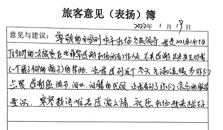 事雖小,但暖人心。數(shù)九寒冬的日喀則,室外冰雪連天,但達(dá)娃央金醫(yī)生這些服務(wù)舉措?yún)s讓張某感受到了春天般的溫暖。他便立即用旅客質(zhì)樸的語(yǔ)言書寫了自己被幫助后的感動(dòng)之情。這也是日喀則航站在2022年收到的第二封感謝信。