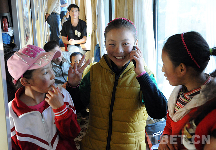 這是乘火車進(jìn)京到北京安貞醫(yī)院進(jìn)行先天性心臟病治療的患兒卓嘎,在火車將抵達(dá)北京時,給阿爸打電話報平安(唐召明2012年9月18日攝)