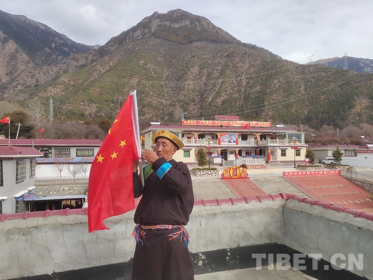 圖為公覺(jué)旦巴在村口為村民們發(fā)放新國(guó)旗