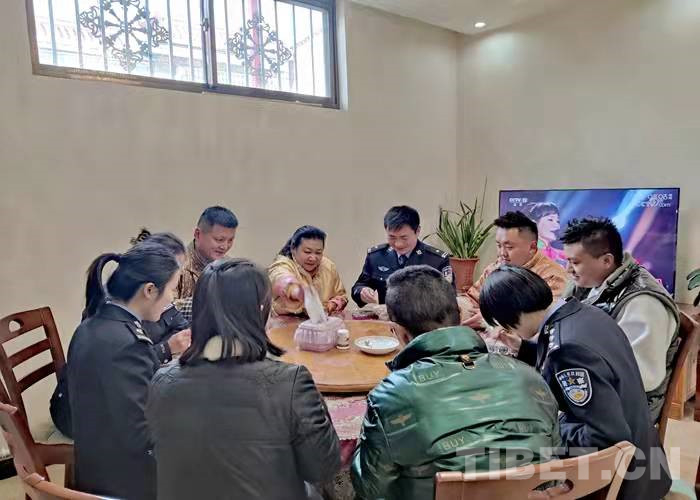 在藏歷水虎年到來(lái)之際,拉薩出入境邊防檢查站3名民警利用勤務(wù)間隙,帶著精心準(zhǔn)備的節(jié)日慰問(wèn)品前往結(jié)親民警尼瑪拉姆家中拜年。熱情好客的尼瑪拉姆一家用特色風(fēng)干肉、煮牛肉、卡塞、時(shí)鮮水果等美食款待了前來(lái)結(jié)親的民警們。