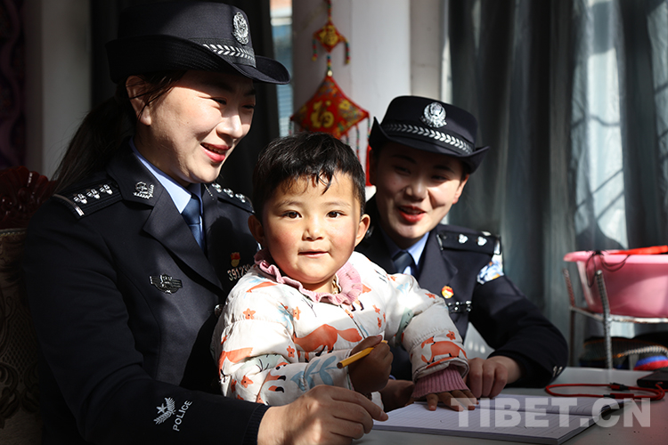 圖為聶拉木出入境邊防檢查站女民警為康珠小朋友輔導(dǎo)寫(xiě)字并為其送上藏歷新年祝福 攝影:索朗次仁