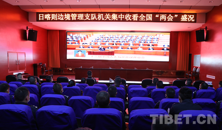 圖為日喀則邊境管理支隊(duì)機(jī)關(guān)民警收看兩會